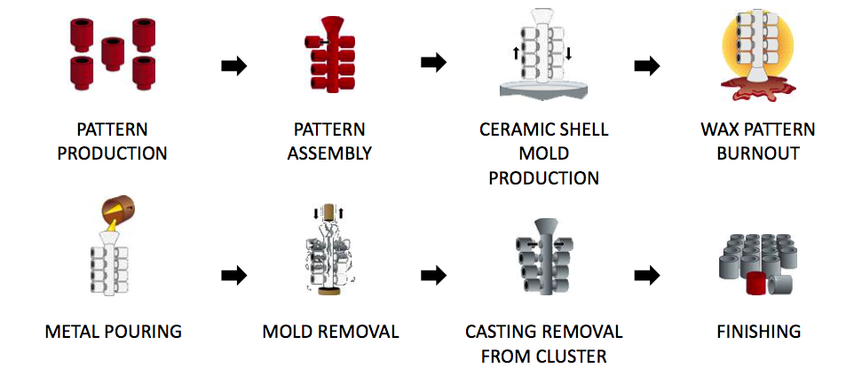 獲取三維數(shù)據(jù)(或三維掃描)——3D打印蠟?zāi)#ā止ぶ颇#N蠟樹(shù)——石膏制?!喑檎婵铡姹菏唷劢饾茶T——?jiǎng)冸x石膏模——沖洗、酸洗、清洗(——稱(chēng)重)——修毛坯,拋光等后處理——產(chǎn)品——檢測(cè)