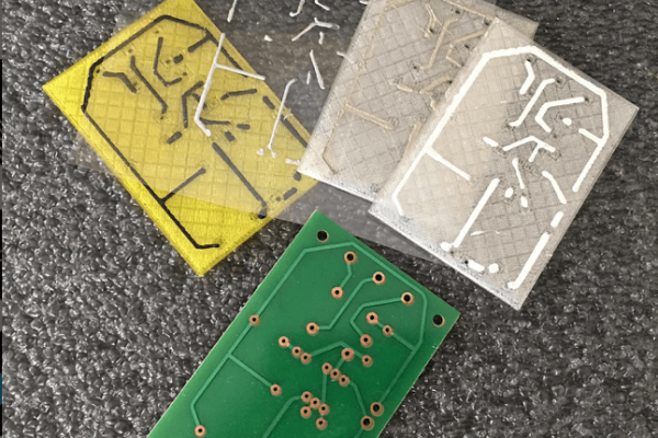 將混合電子 3D 打印用于 2D 打印應(yīng)用程序。在印刷電路板上用金色油墨打印。用銀漿打印互連。在玻璃上制作一個線性空間陣列,在卡普頓上打印線圈??赡苄允菬o限的。